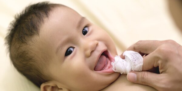 餐後用紗巾擦拭寶寶的牙根污垢,讓寶寶意識到餐後要清潔牙齒。