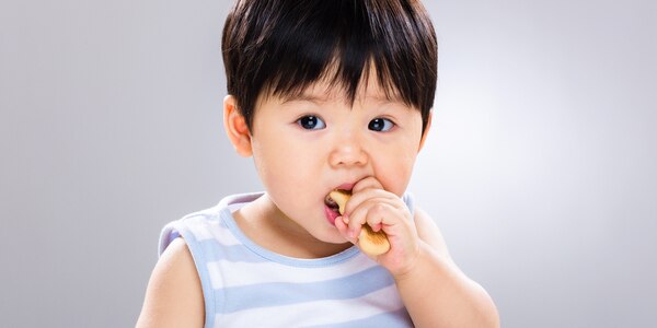 - 寶寶開始懂得體驗更多質感,會嘗試自行用手放食物入嘴吃,可給寶寶一些大小適中的軟身蔬果或星星餅