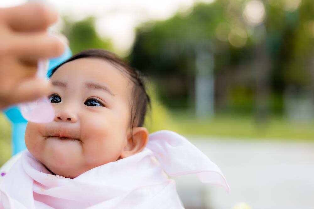 - 寶寶合上嘴後,以水平方向取出匙羹,不要把食物倒入他的口內