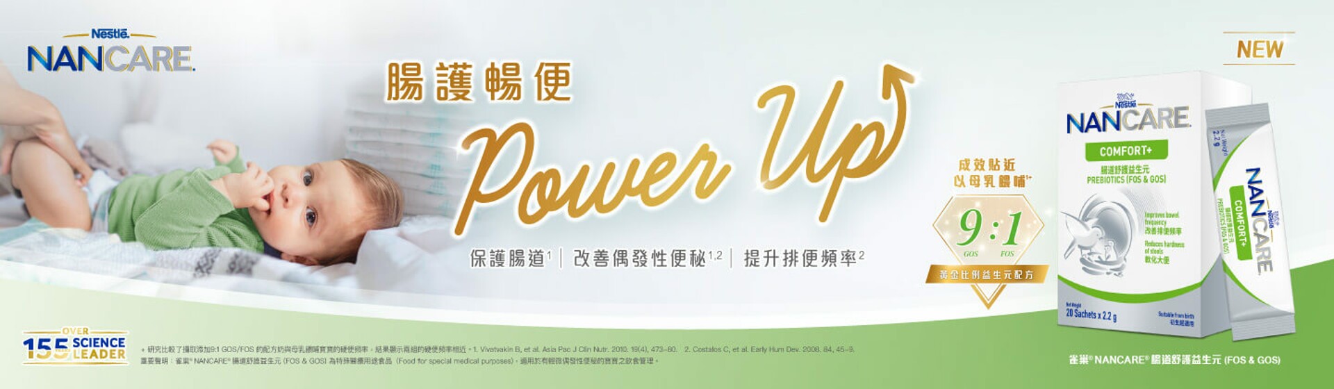 雀巢運用155年內不斷累積的嬰幼兒營養知識及科研經驗,為大家帶來全新 NANCARE®腸道舒護益生元 (FOS & GOS),以科研智慧守護寶寶健康!特有9:1黃金比例益生元配方,有助維持健康腸道益菌生態,保護寶寶腸道1,改善偶發性便秘1,2,守護寶寶腸道健康!
